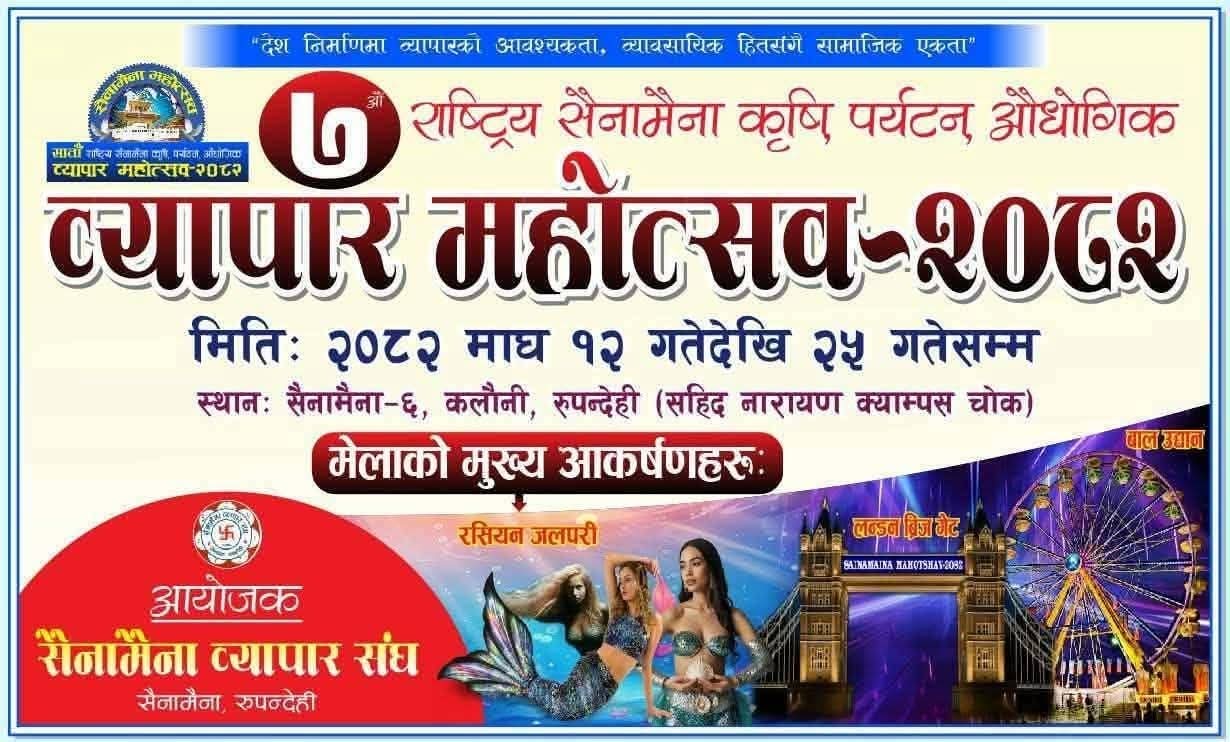 बिमल गैरे, सैनामैना । “देश निर्माणमा व्यापारको आवश्यकता, व्यावसायिक हितसँगै सामाजिक एकता” भन्ने मूल नारासहित आयोजना हुने राष्ट्रिय सैनामैना कृषि, पर्यटन तथा औद्योगिक व्यापार महोत्सव–२०८२ को तयारी सुरु गरिएको छ। माघ १२ गतेदेखि २५ गतेसम्म सञ्चालन हुने उक्त महोत्सव सैनामैना नगरपालिका–६, कलौनीस्थित सहिद नारायण पोखरेल रामापुर क्याम्पस चोकमा आयोजना गरिनेछ। महोत्सवको...