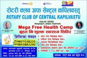 कपिलवस्तु । रोटरी क्लब अफ सेन्ट्रल कपिलवस्तुको आयोजनामा हिजो (सनिवार) जिल्लाको बाणगंगा नगरपालिका ८ बोडगाउँमा निशुल्क स्वास्थ्य शिविर सम्पन्न भएको छ । क्लबका प्रमुख धर्मराज भट्टराईको अध्यक्षता, लुम्बिनी प्रदेश सभा सदस्य गिरधारिलाल न्यौपानेको प्रमुख आतिथ्यता, बाणगंगा नगरपालिकाका मेयर चक्रपाणी अर्याल, क्लबका एजी प्रेम भुर्तेल, सेन्ट्रल बुटबलका पुर्व अध्यक्ष बाबुराम भट्टराईको विशिष्ट आतिथ्यतामा उक्त शिविर सम्पन्न भएको हो ।