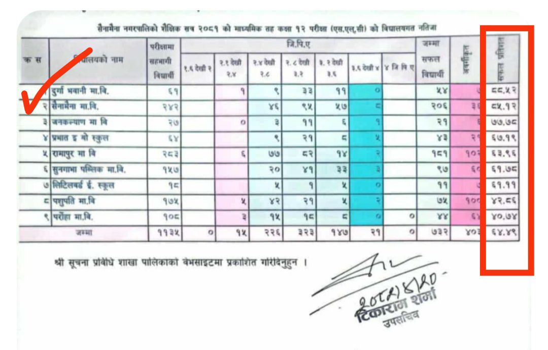 भर्खरै सार्वजनिक भएको राष्ट्रिय परीक्षा बोर्ड (NEB) कक्षा १२ को नतिजामा दुर्गा भवानी माध्यमिक विद्यालय, सैनामैना–१, बनकट्टाले नगरमै उत्कृष्ट सफलता हासिल गरेको छ ।