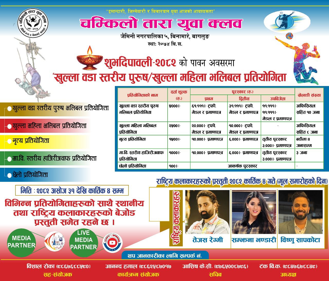 बागलुङ । जैमिनी नगरपालिका–५, बिनामारेस्थित चम्किलो तारा युवा क्लबले शुभ दीपावली–२०८२ को पावन अवसरमा खुल्ला वडा स्तरीय पुरुष तथा महिला भलिबल प्रतियोगिता, नृत्य प्रतियोगिता, हाजिरीजवाफ एवंम छेलो प्रतियोगिता आयोजना गर्ने भएको छ।