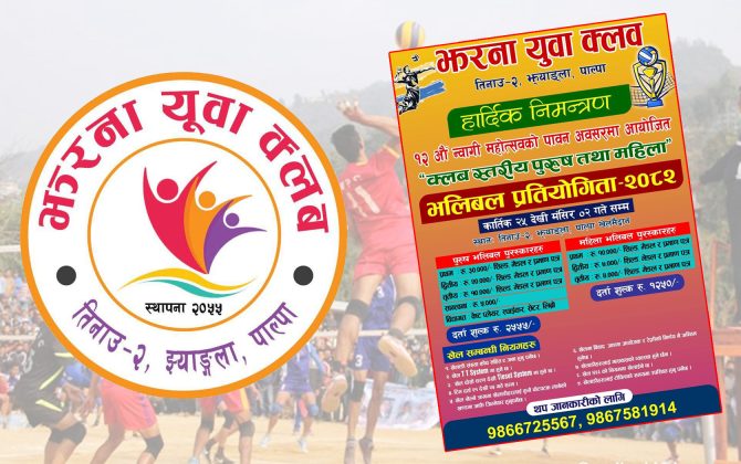 पाल्पा  । झरना युवा क्लब, तिनाउ–२ झ्याङ्ला, पाल्पाले १२औं न्वागी महोत्सवको पावन अवसरमा क्लब स्तरीय पुरुष तथा महिला भलिबल प्रतियोगिता–२०८२ आयोजना गर्ने भएको छ।