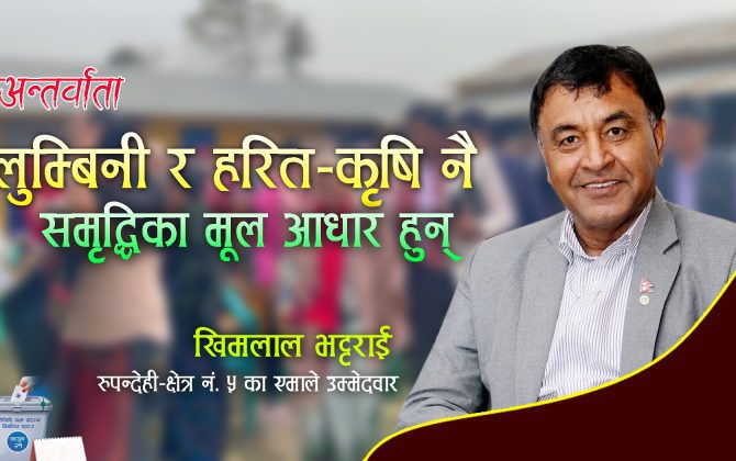 रुपन्देहीको क्षेत्र नं. ५ मा नेकपा एमालेको तर्फबाट उम्मेदवार बनेका युवा नेता खिमलाल भट्टराईले बुद्धभूमि लुम्बिनी, हरित–कृषिलाई यसक्षेत्रको समृद्धिको आधार मान्दै सोही अनुरुपको प्रतिबद्धतापत्र सार्वजनिक गर्नुभएको छ । लुम्बिनी जस्तो पवित्र सम्पदा स्थल, बुद्धसंग जोडिएका क्षेत्र, खेतीयोग्य जमिन प्रसस्त रहेको क्षेत्र समेत रहेकाले यसक्षेत्रमा पर्यटन र कृषि नै समृद्धिका मूल आधार मानिन्छन् । यहीँ सेरोफेरोमा रहेर पत्रकार अमृत गिरीले नेता भट्टराईसंग गरेको कुराकानीको सम्पादित अंश यहाँ अन्तर्वार्ताका रुपमा प्रस्तुत गरिएको छ ।