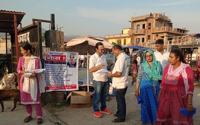यसैबीच, आज हाटबजारमा फरक दृश्य देखिएको छ। बजार गेटमै बसेर स्वतन्त्र अध्यक्ष पदका उम्मेदवार नेत्र थापाले आउने–जाने सर्वसाधारणलाई चिसो पानी खुवाउँदै आफ्ना लिखित एजेन्डा वितरण गर्नुका साथै प्रत्यक्ष रूपमा आफ्ना योजना सुनाउँदै मत माग्नुभएको थियो।