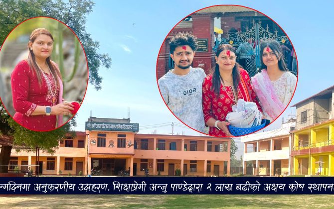 उपकार अनलाईन, सैनामैना । सैनामैना–८ निवासी समाजसेवी तथा शिक्षाप्रेमी अन्जु पाण्डेले आफ्नो जन्मदिनलाई सामाजिक सेवासँग जोड्दै एक प्रेरणादायी कार्य गर्नुभएको छ। उहाँले छोरा रबिन पाण्डे र छोरी रन्जिता पाण्डेको सहयोगमा स्वर्गीय बुवा नुमलाल पाण्डे, माता गोमकला पाण्डे तथा स्वर्गीय श्रीमान कमलप्रसाद पाण्डेको पवित्र स्मृतिमा श्री जनचेतना माध्यमिक विद्यालयमा अक्षय कोष स्थापना गर्नुभएको हो।