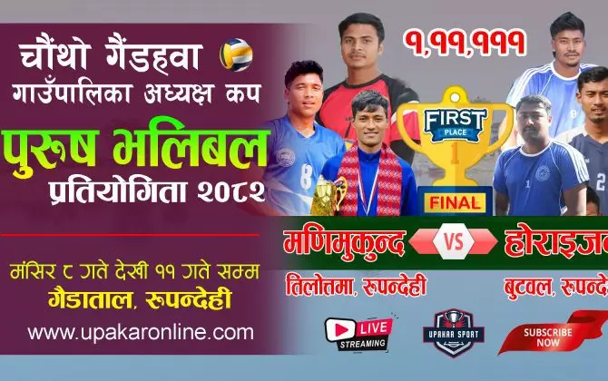 विमल गैरे, रुपन्देही । चौंथो गैडहवा गाउँपालिका अध्यक्ष कप पुरुष भलिवल प्रतियोगिता तथा विविध सांस्कृतिक कार्यक्रम–२०८२ सफलतापूर्वक सम्पन्न भएको छ । कार्यक्रमको आयोजना श्री शान्ति युवा क्लब, गैडहवा–४ ले गरेको हो । अन्तिम प्रतिस्पर्धामा न्यु होराइजन...