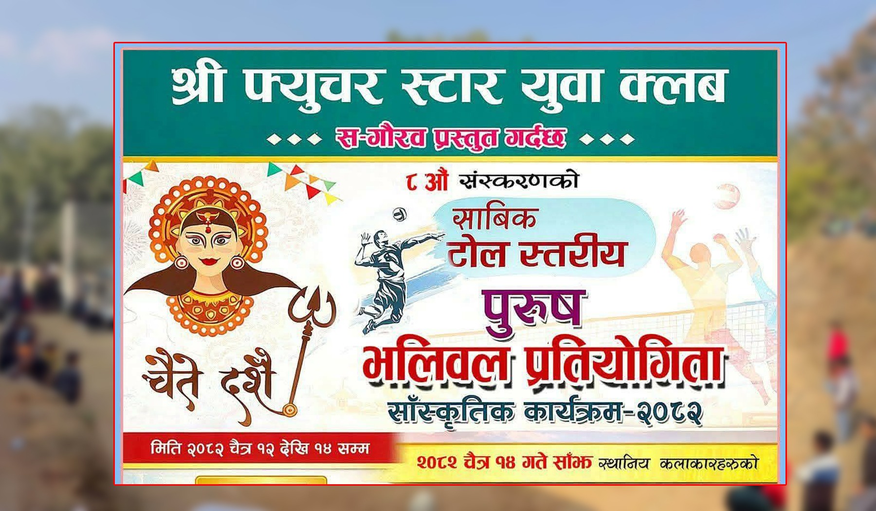 पाल्पा। माथागढी–७, धुनुवा टोल खेलमैदानमा “८ औं संस्करणको साविक टोल स्तरीय पुरुष भलिबल प्रतियोगिता तथा सांस्कृतिक कार्यक्रम–२०८२” आयोजना हुने भएको छ। श्री फ्युचर स्टार युवा क्लबको आयोजनामा चैत १२ गतेदेखि १४ गतेसम्म सञ्चालन हुने प्रतियोगितामा विभिन्न टोलका टिमहरूबीच प्रतिस्पर्धा हुने आयोजकले जनाएको छ। प्रतियोगितामा प्रथम हुने...